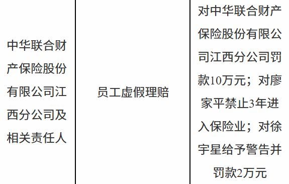 1月23日赢盈配资,国家金融监督管理总局江西监管局行政处罚信息公开表显示,中华联合财产保险股份有限公司江西分公司因员工虚假理赔被罚款10万元;责任人廖某平被禁止3年进入保险业;徐某星被给予警告并罚款2万元。